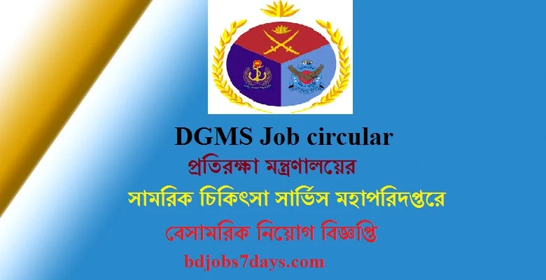 গণপ্রজাতন্ত্রী বাংলাদেশ সরকারের প্রতিরক্ষা মন্ত্রণালয় (Ministry of Defence MOD) - এর নিয়ন্ত্রণাধীন সামরিক চিকিৎসা সার্ভিস মহাপরিদপ্তর (DGMS) এবং এর আওতাধীন আন্তঃবাহিনী মেডিক্যাল ইউনিটসমূহের শূন্য পদে বেসামরিক লোক নিয়োগের জন্য - সরকারি চাকুরির নিয়োগ বিজ্ঞপ্তি প্রকাশিত হয়েছে। Ministry of Defence MOD - এর নিয়ন্ত্রণাধীন সামরিক চিকিৎসা সার্ভিস মহাপরিদপ্তর (DGMS) - এ শূণ্য পদসমূহে রাজস্ব খাতে নিয়োগের নিমিত্তে বাংলাদেশের প্রকৃত নাগরিকদের চাকরির সুযোগ দেওয়া হচ্ছে। প্রতিরক্ষা মন্ত্রণালয় (Ministry of Defence MOD) - এর নিয়ন্ত্রণাধীন সামরিক চিকিৎসা সার্ভিস মহাপরিদপ্তর (DGMS) এ ১৪ টি পদে সর্বমোট ৪৩ জন বেসামারিক প্রার্থীকে নিয়োগ দেওয়া হবে। পদগুলোতে পুরুষ ও নারী প্রার্থীগণই আবেদন করতে পারবেন। অনলাইনে আবেদন করার জন্য নিচে নিয়োগের পদ সমূহ এবং আবেদন পদ্ধতি বিস্তারিত উল্লেখ করা হলো।