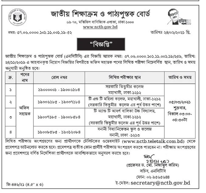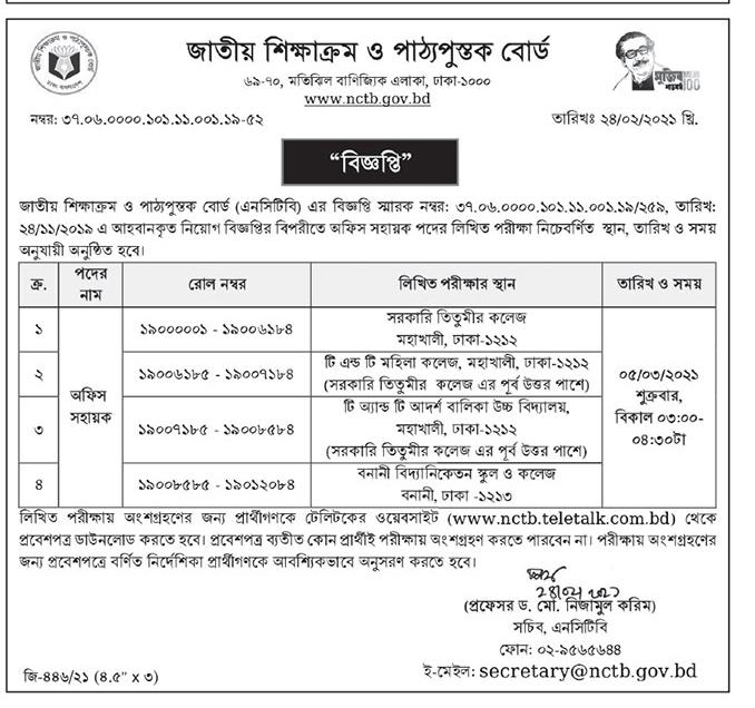 গণপ্রজাতন্ত্রী বাংলাদেশ সরকারের জাতীয় শিক্ষাক্রম ও পাঠ্যপুস্তক বোর্ড, ঢাকা বাংলাদেশ (National Curriculum of Textbook Board NCTB) Dhaka, Bangladesh এ অফিস সহায়ক পদের লিখিত পরীক্ষা আগামী ০৫/০৩/২০২১ তারিখে বিকাল ০৩:০০ টা থেকে ৪:৩০ টা পর্যন্ত এবং উপসহকারী প্রকৌশলী পদের মৌখিক পরীক্ষা আগামী ০৬/০৩/২০২১ তারিখে নির্দিষ্ট সময়ে অনুষ্ঠিত হবে।