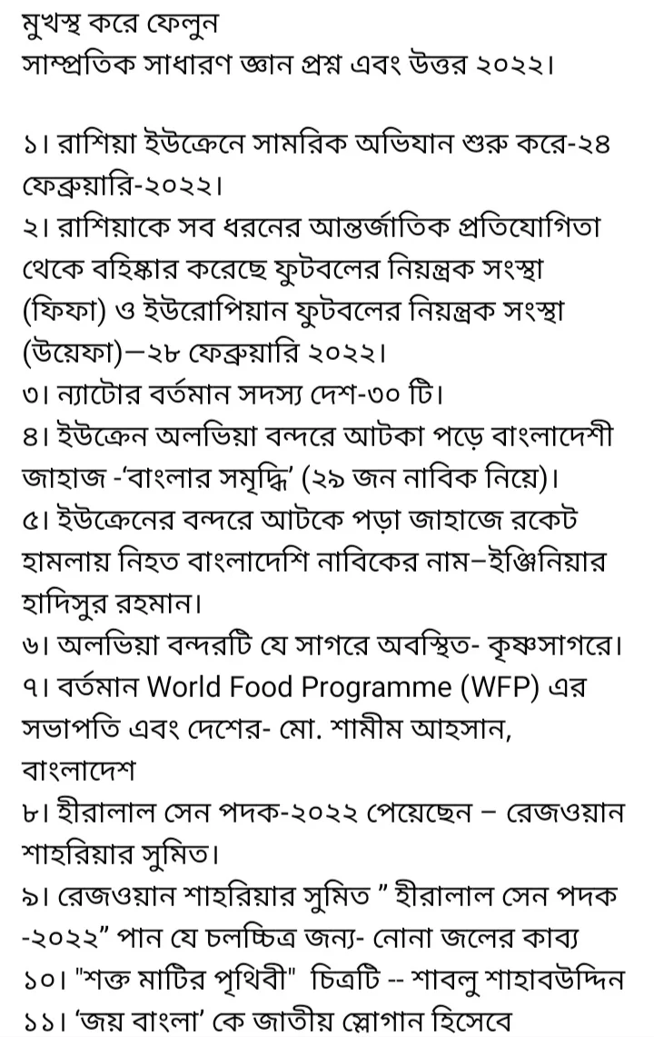 সাধারণ জ্ঞানের জন্য আপনি এগুলো ভালো করে দেখে যাবেন এখান থেকে আপনি ১০ নম্বর পাবেন নিশ্চিত থাকতে পারেন পর্যায়ক্রমে আমরা আরো দিব এই পোষ্টের মধ্যে আমাদের সাথে থাকুন।