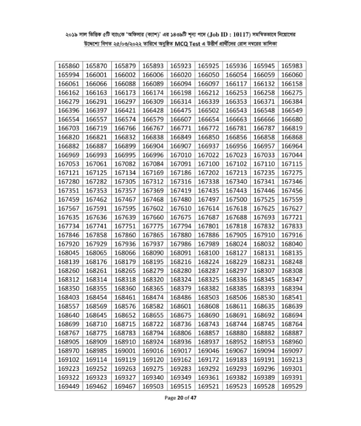 ২০১৯ সাল ভিত্তিক পাঁচটি ব্যাংকে অফিসার ক্যাশ এর ১৪৩৯ শূন্যপদে job id ১০১১৭ সম্মিলিতভাবে নিয়োগ এর উদ্দেশ্য বিগত ২৫/০৩/২০২২ তারিখে অনুষ্ঠিত MCQ Test এ উত্তীর্ণ প্রার্থীদের Written Test গ্রহণের সময় সূচি ও পরীক্ষার কেন্দ্রের তালিকা সংক্রান্ত বিজ্ঞপ্তি