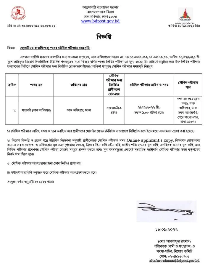 ডাক অধিদপ্তর (Directorate of Posts) এ “বাংলাদেশ ডাক বিভাগের অধীনস্থ মৌখিক পরীক্ষার তারিখ সংবলিত উক্ত বিজ্ঞপ্তিটি দেখতে নিচের এ ক্লিক করুনঃ