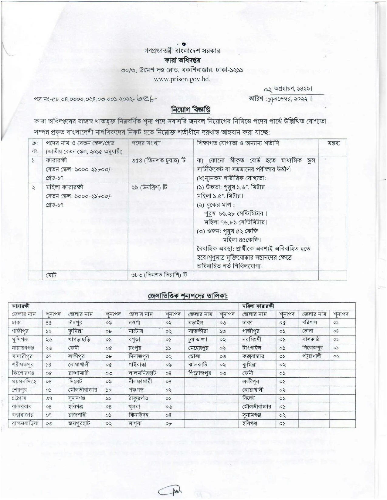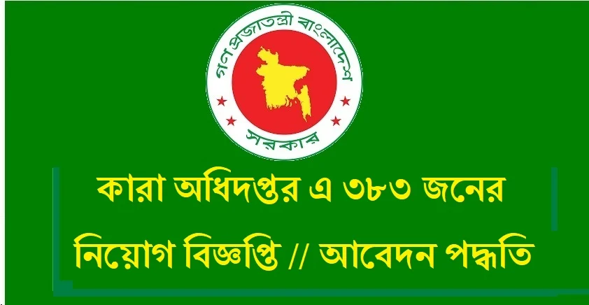 কারা অধিদপ্তর (Department of Prisons) এ ৩৮৩ পদে নিয়োগের বিস্তারিত জানতে নিচের বিজ্ঞপ্তিটি দেখুনঃ