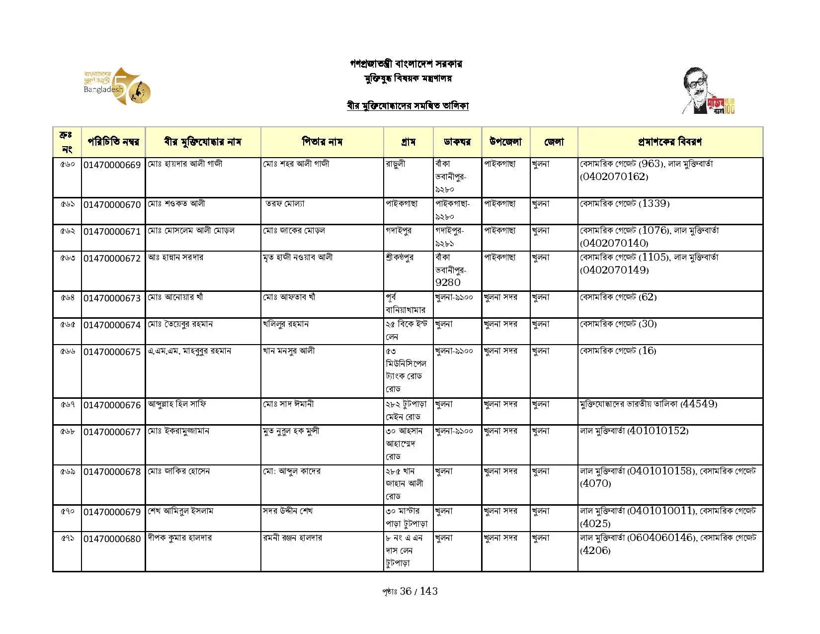খুলনা সদর, পাইকগাছা রুপসা দিঘলিয়া, তেরখাদা,বটিয়াঘাটা,দাকোপ,ডুমুরিয়া, ফুলতলা,কয়রা এ মুক্তিযোদ্ধা তালিকার বিজ্ঞপ্তি প্রকাশ