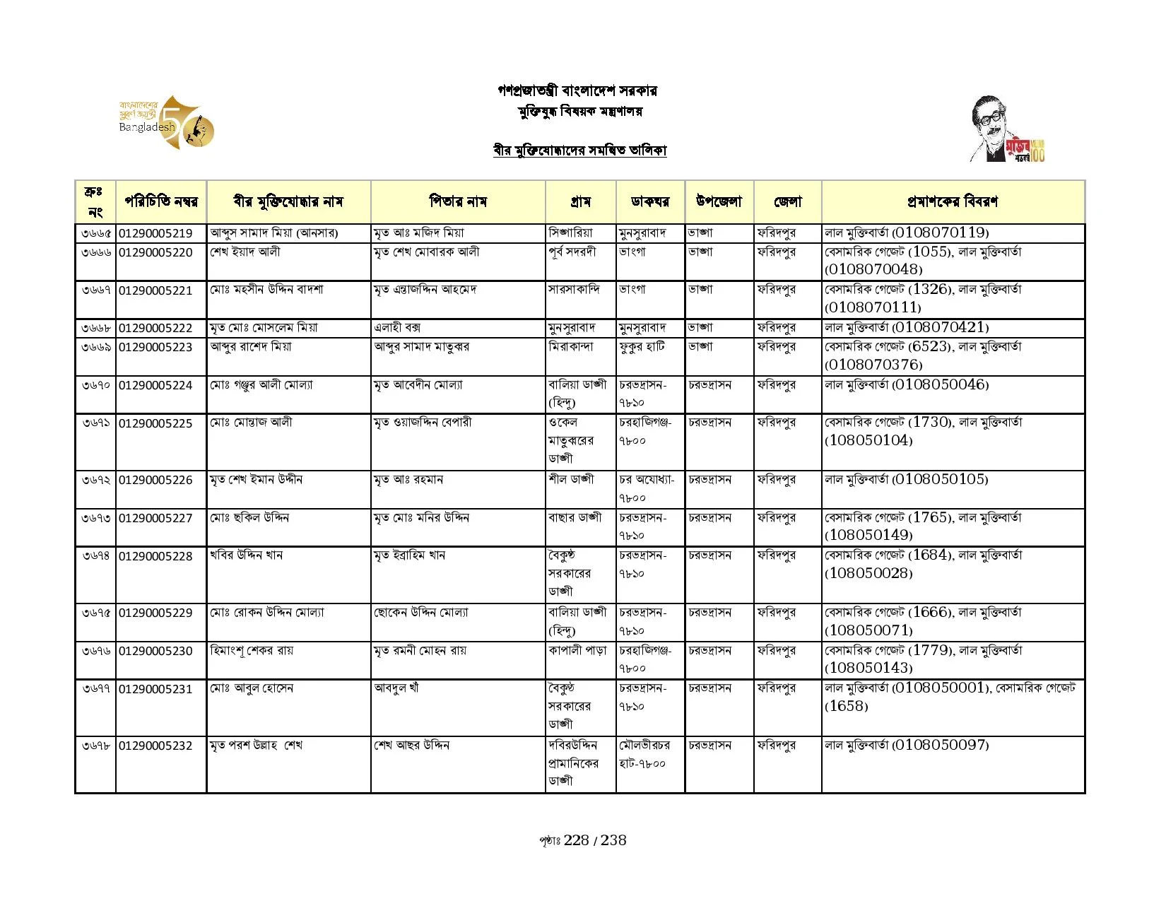 মুক্তিযোদ্ধা তালিকার বিজ্ঞপ্তি প্রকাশ ২০২৩ অনুযায়ী ফরিদপুর জেলার থানা ডাকঘর গ্রাম সমূহের মুক্তিযোদ্ধা তালিকা