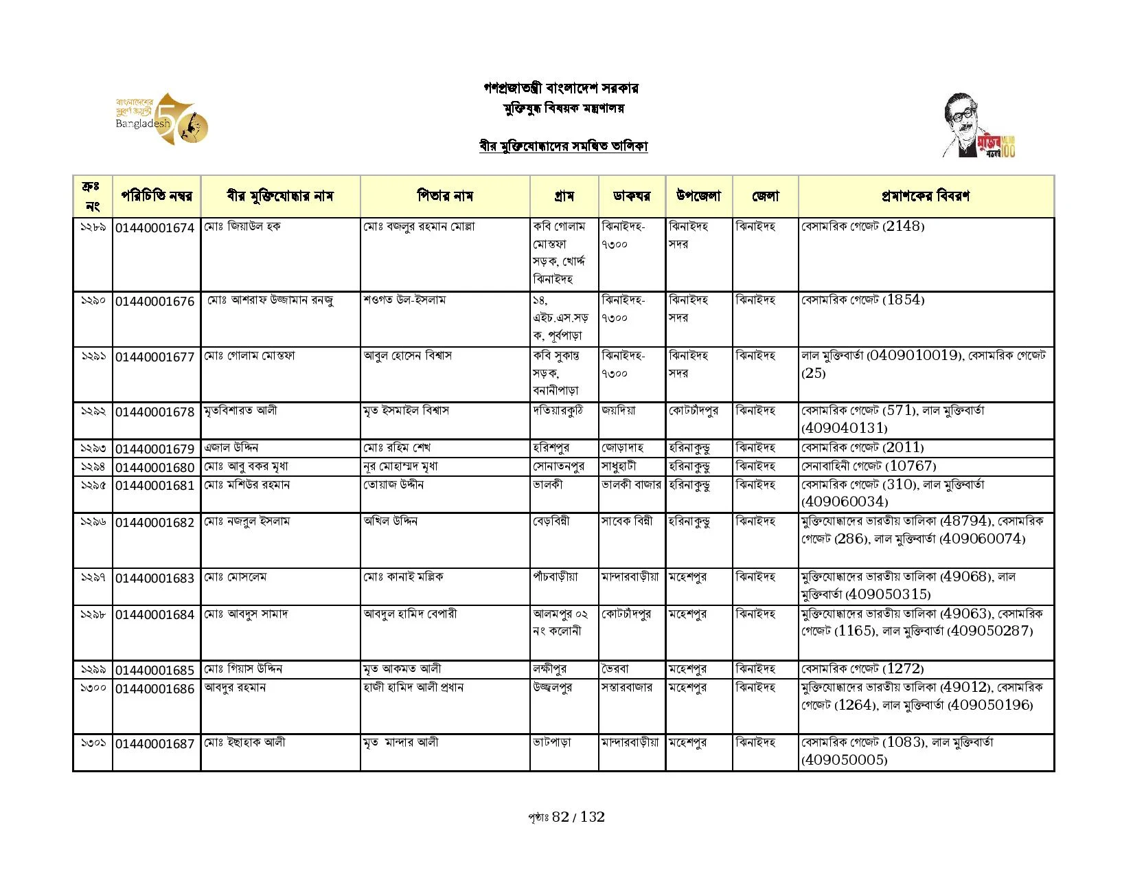 মুক্তিযোদ্ধা তালিকার বিজ্ঞপ্তি প্রকাশ ২০২৩ অনুযায়ী ঝিনাইদহ জেলার থানা ডাকঘর গ্রাম সমূহের মুক্তিযোদ্ধা তালিকা