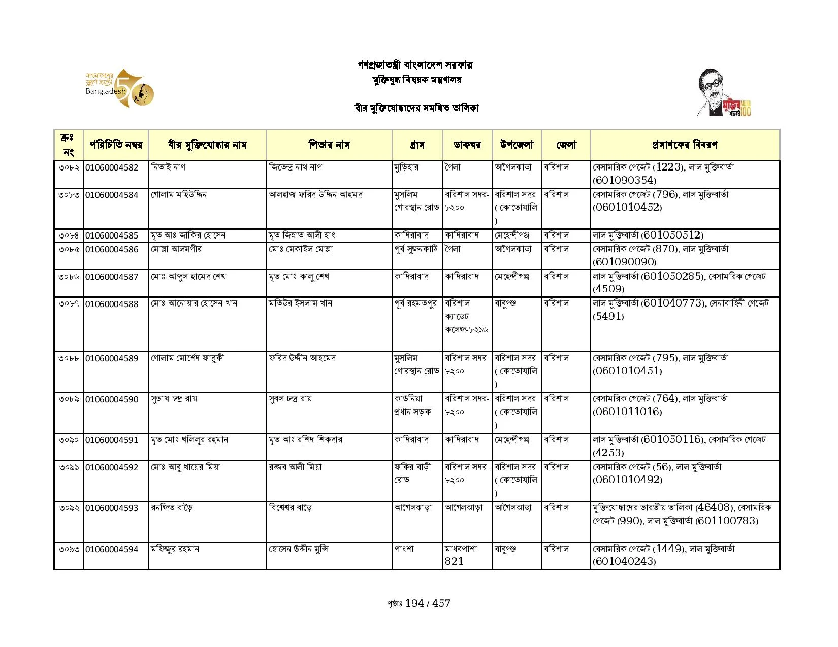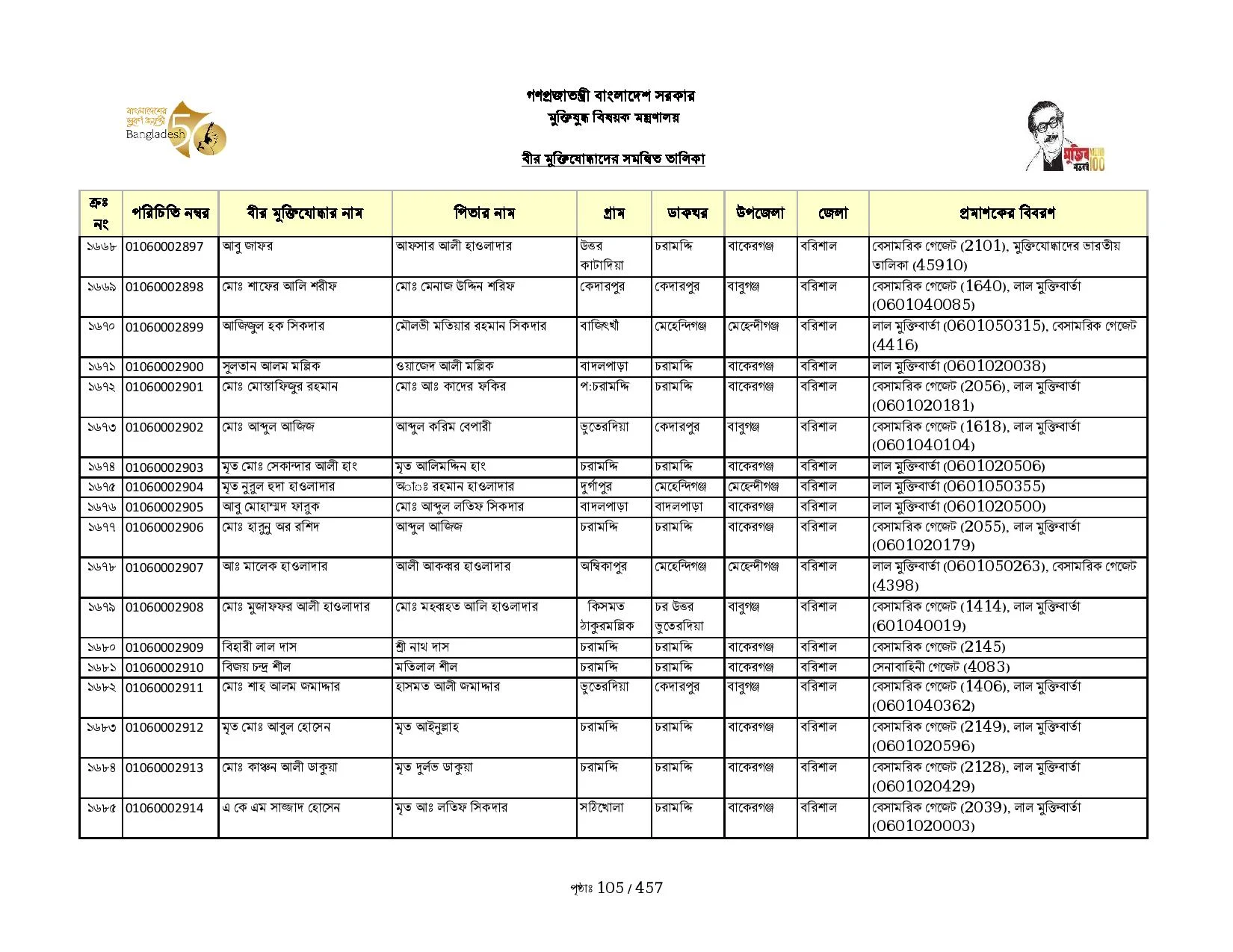 বরিশাল জেলার মুক্তিযোদ্ধার নতুন তালিকা
