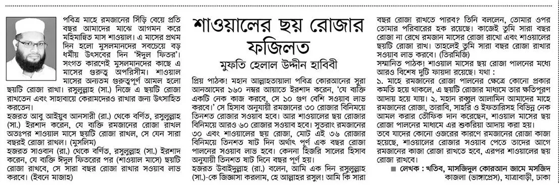 পবিত্র মাহে রমজানের সিঁড়ি বেয়ে প্রতি বছর আমাদের মাঝে আগমন করে মহিমান্বিত মাস শাওয়াল। এ মাসের প্রথম দিন হলো মুসলমানদের সবচেয়ে বড় ধর্মীয় উৎসবের দিন ‘ঈদুল ফিতর’। সংগত কারণেই মুসলমানদের কাছে এ মাসের গুরুত্ব অপরিসীম। শাওয়াল মাসের অন্যতম গুরুত্বপূর্ণ আমল হলো ছয়টি রোজা রাখা। রসুলুল্লাহ (সা:) নিজে এ ছয়টি রোজা রাখতেন এবং সাহাবায়ে কেরামদেরও রাখার জন্য উৎসাহিত করতেন । হযরত আবু আইয়ুব আনসারী (রা:) থেকে বর্ণিত , রসুলুল্লাহ (সা:) ইরশাদ করেন, যে ব্যাক্তি রমজানের রোজা রাখল অতঃপর শাওয়াল মাসে ছয়টি রোজা রাখল সে যেন সারা বছর রোজা রাখার সওয়াব লাভ করবে।